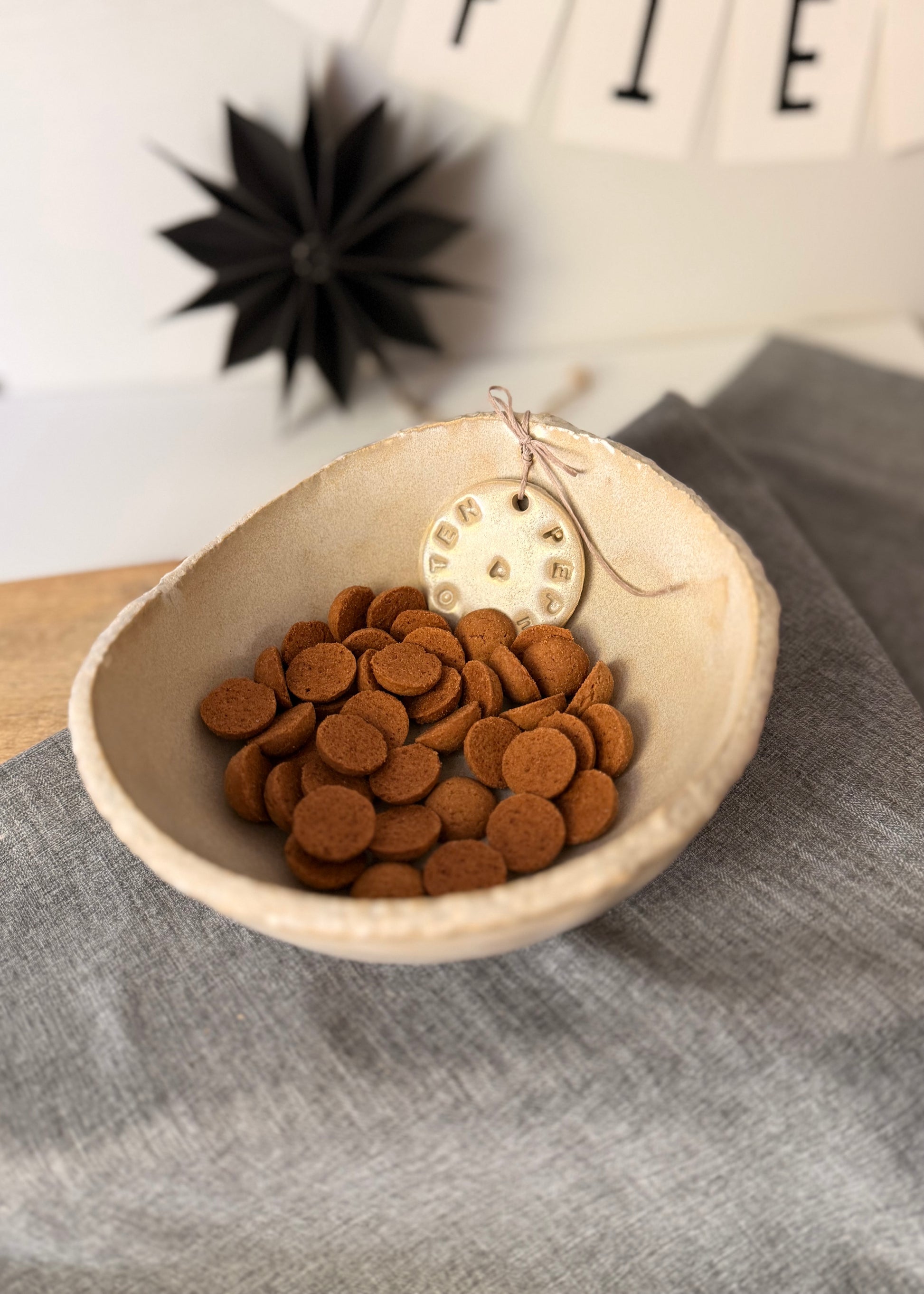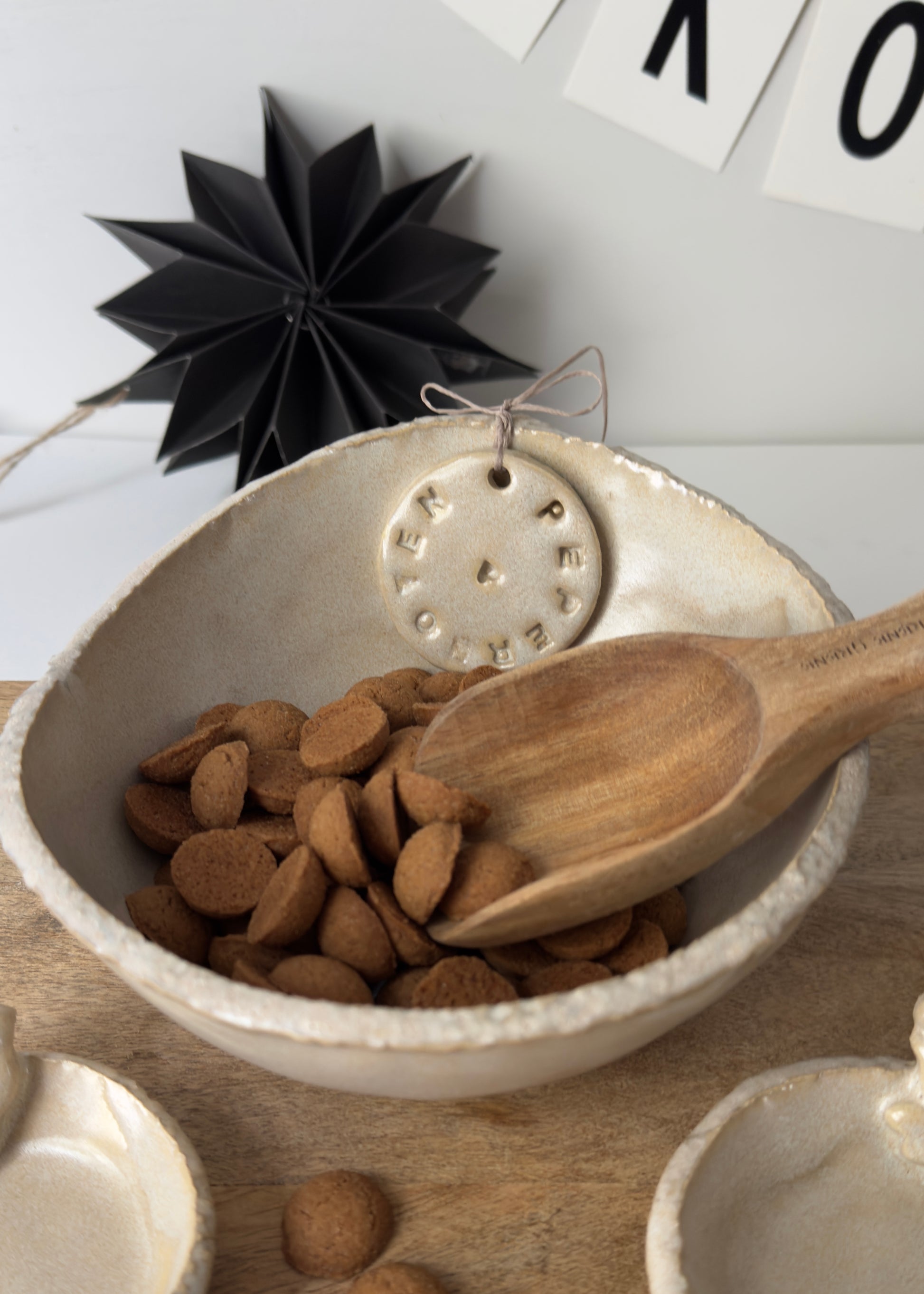 Uniek handgemaakt keramisch schaaltje met een prachtige beige room, gemailde glazuurafwerking en verwisselbaar decoratief ornament. Dit veelzijdige ambachtelijke schaaltje is perfect voor zowel de Sinterklaas- als de kerstperiode.