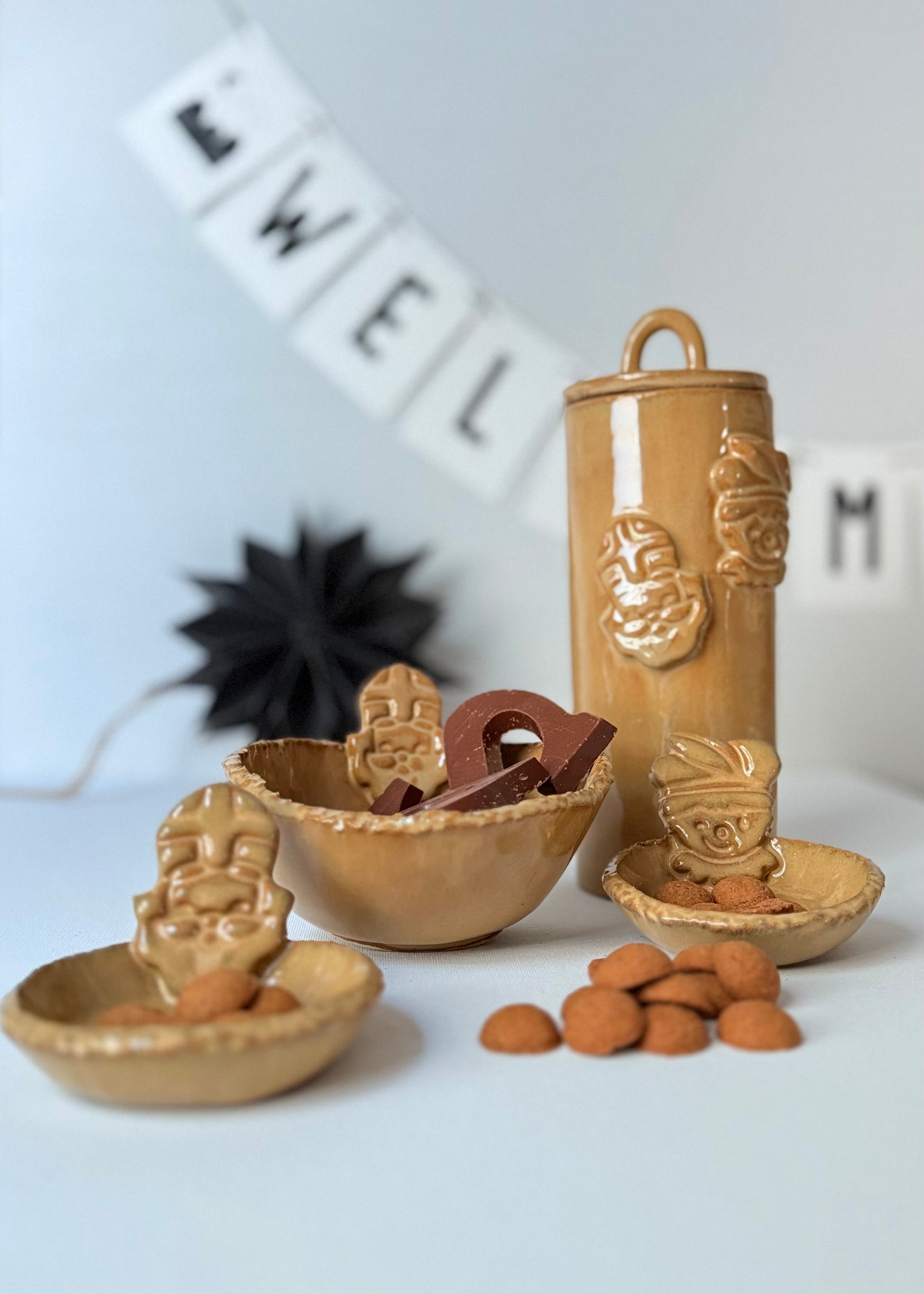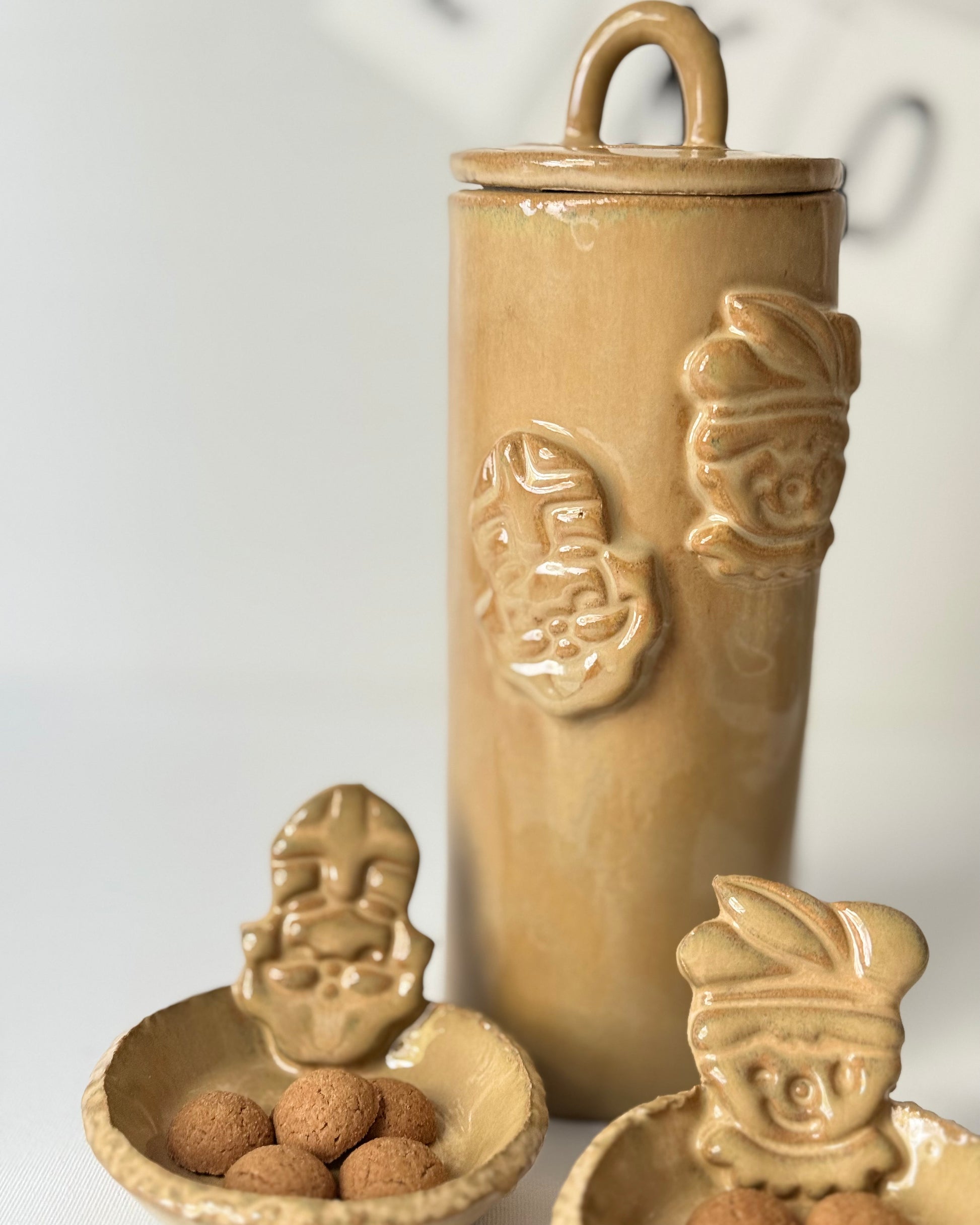 Stijlvolle keramische handgemaakte voorraadpot speciaal ontworpen voor het bewaren van pepernoten en andere Sinterklaas lekkernijen. Deze decoratieve pot combineert functionaliteit met feestelijk design.