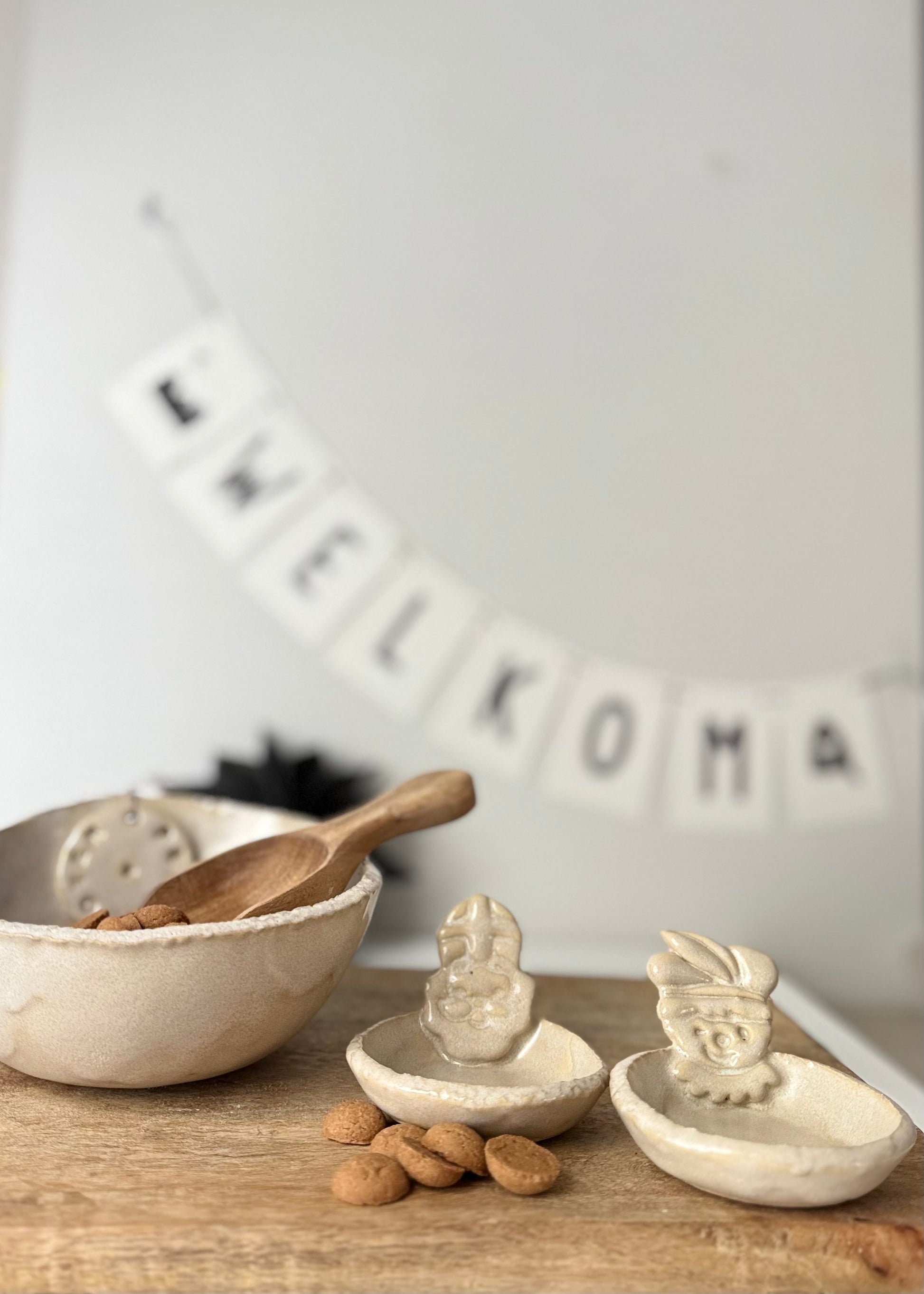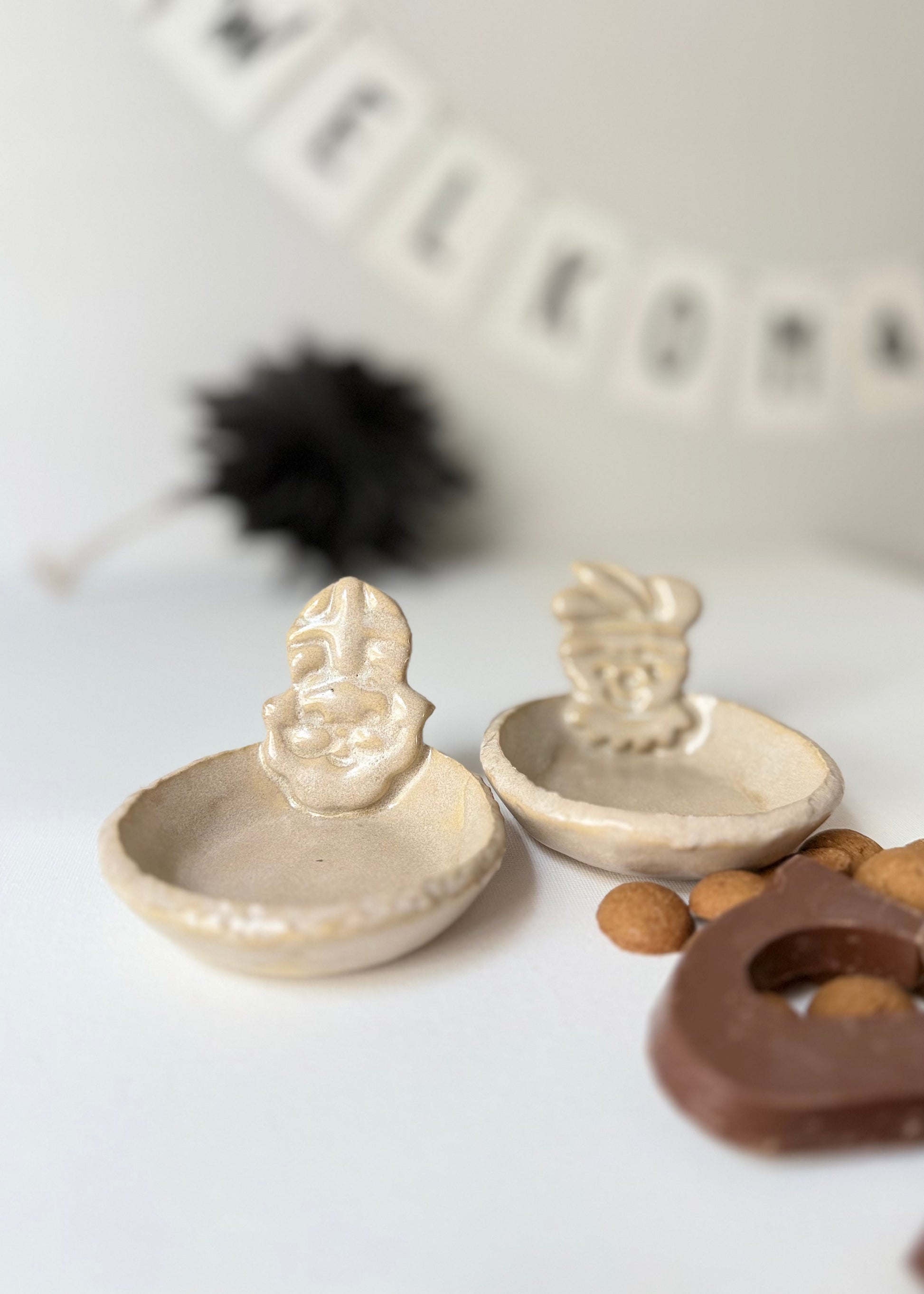 Handgemaakte keramische schaaltjes in een feestelijk Sint en Piet thema. Deze unieke set combineert vakmanschap met traditionele Nederlandse festiviteiten.